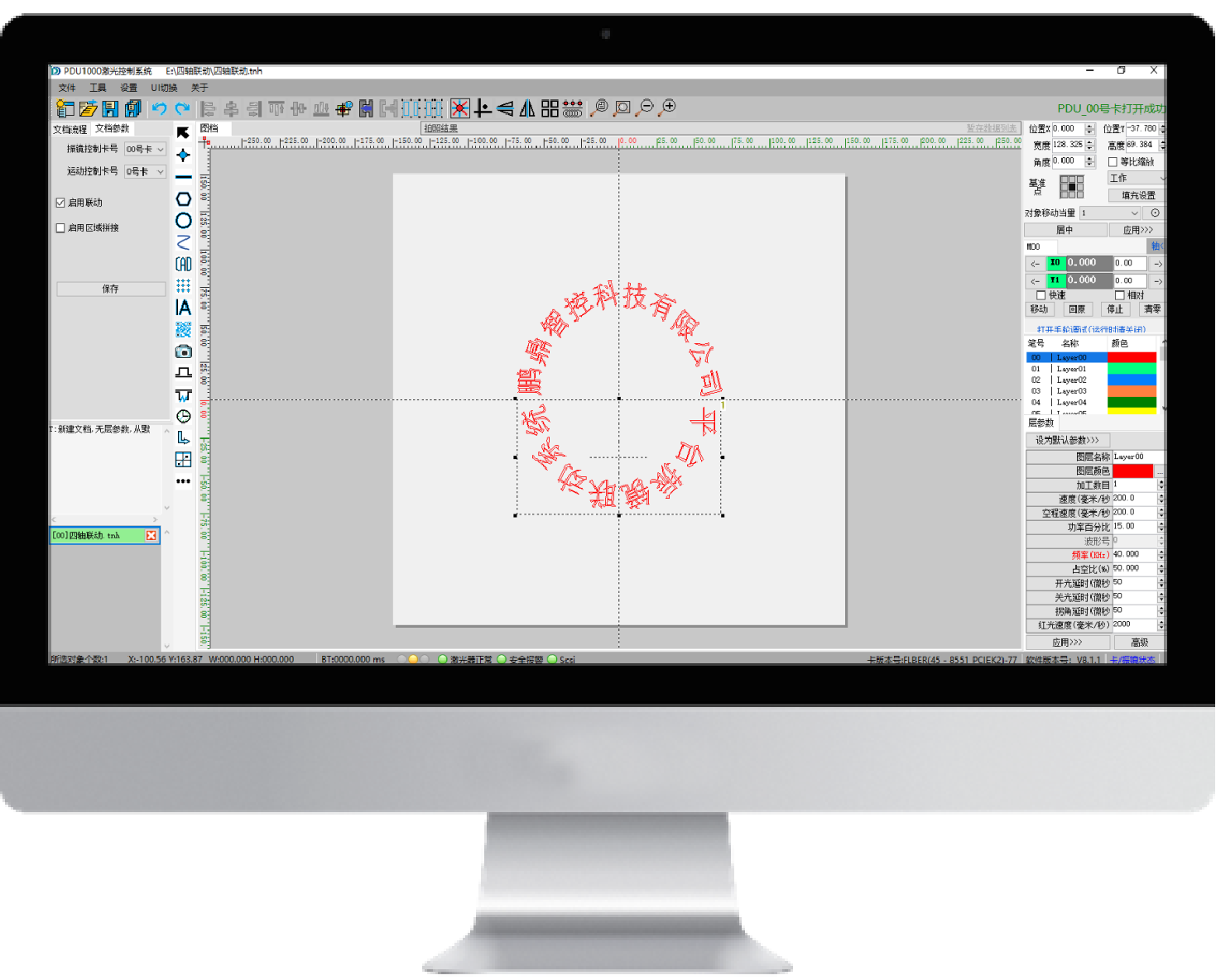 四轴联动系统主要由激光扫描振镜、运动平台、PCIE控制卡以及通宝TB888智能振镜激光控制软件组成,拥有无限视野加工功能。是通宝TB888自研的激光器、振镜、平台、实时全闭环控制系统。解决了传统振镜对加工范围受限的问题,而且不存在缝合误差,适合于大尺寸、高精度的激光加工应用。